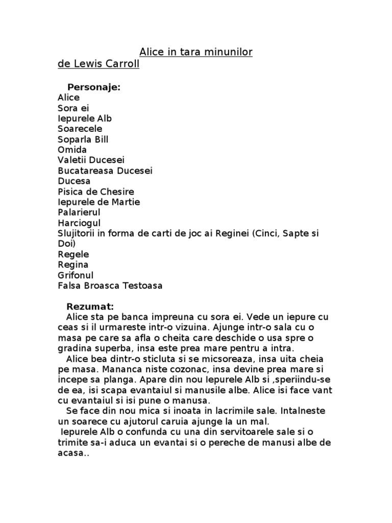 Alice In Tara Minunilor Personaje. Acest rezumat al cartii alice in tara minunilor de lewis caroll, ar trebui sa te indemne sa citesti in intregime povestea lui alice, cu atat mai mult cu cat in aceasta scurta prezentare nu sunt incluse, glumele, jocurile de cuvinte, dialogurile si alte lucruri de pret ce fac aceasta carte atat de fermecatoare. Jocul de crocket era tare ciudat. Clyde geronimi, wilfred jackson, hamilton luske. Personaje alice intra in casa si mananca niste cozonac care o face sa creasca din nou, pana cand nu mai incape in camera. Alice este personajul feminin principal al poveștii, care are vreo șapte ani.