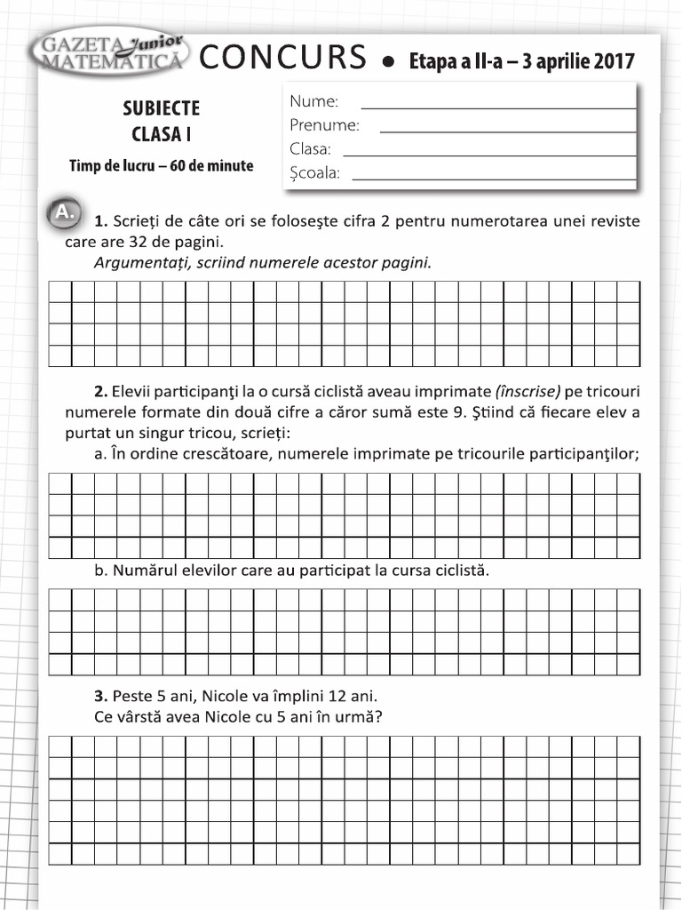 Prima etapa a concursului gazeta matematica junior de anul acesta va incepe pe 30 ianuarie. 3688/13.10.2017 pentru utilizarea extinsă la clasă. Etapa i a concursului se desfasoara in data de 29 ianuarie 2020. Concursul se desfăşoară direct în instituţiile de învăţământ preuniversitar. Download as pdf or read online from scribd.