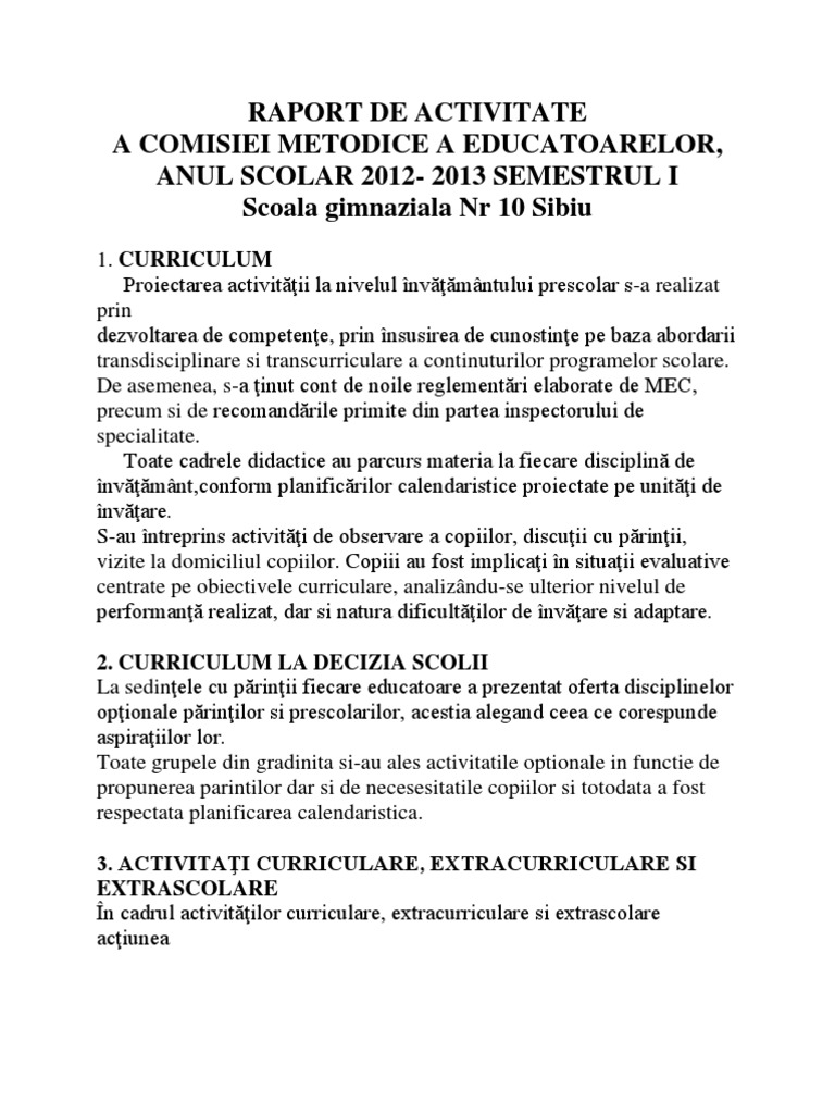 Activitatea trm în semestrul i al anului în curs a constituit parte integrantă a reformei preconizate pentru o perioadă mai lungă de timp şi a fost axată. Scoala gimnaziala nr.1 vlad tepes. Comisia metodică !ia desfă!urat activitatea pe ba za. Modèle de rapport d'activité prête à l'emploi et entièrement adapté à vos besoins à télécharger gratuitement sous format word. Raport de activitate semestrul i, an școlar 20122013 clasele iii pregătitoare prezentul raport sintetizează principalele activită ţi derulate în primul semestru al anului !colar 2012/ 2013 de învăţătoarele claselor i ii !i grupelor pregătitoare.