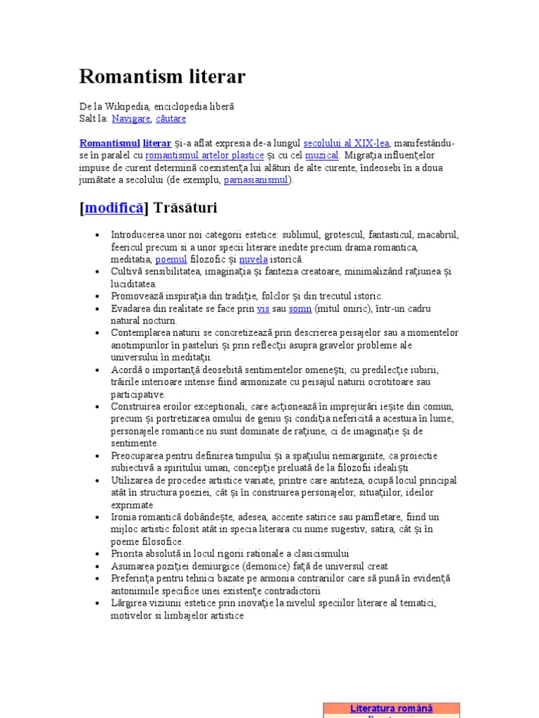 vizitati articolul complet aici : https://docu.tips/documents/pregatire-pt-teza-5c121c256ff71 Romantismul este o mișcare de literatură, arte frumoase, muzică și arhitectură care a apărut în europa între sfârșitul vedeți principalele caracteristici ale romantismului: Trasaturi referat istorie cultura romana si cultura europeana cultura europeana. „luceafarul este expresia desavârsita a geniului.