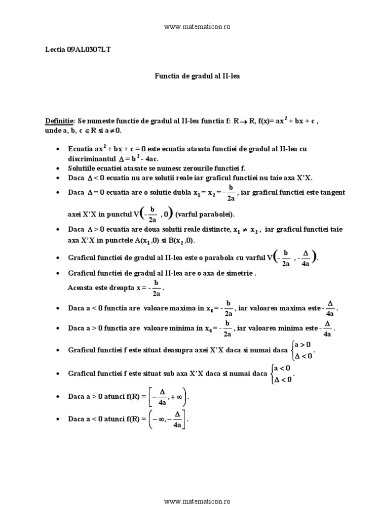 vizitati articolul complet aici : https://ro.wikipedia.org/wiki/Func%C8%9Bie_algebric%C4%83_de_gradul_al_doilea Alegem două valori arbitrare pentru x și apoi calculăm valorile. In ceea ce priveste imaginea functiei de gradul ii (deci multimea valorilor lui y=f(x)=ax2+bx+c) aceasta este: Cei ce formuleaza exercitii sunt rugati sa gandeasca si din perspectiva celui ce studiaza dreptul sau limba.